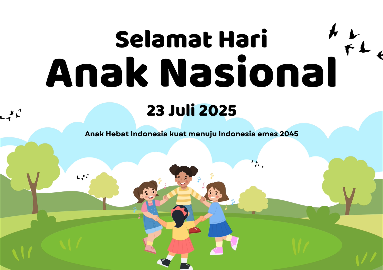 Hari Anak Nasional (HAN) pada tanggal 23 Juli 2025 dengan mengusung tema utama “Anak Hebat, Indonesia Kuat Menuju Indonesia Emas 2045.” Tema tersebut dipilih sebagai wujud komitmen bangsa untuk mempersiapkan generasi muda yang cerdas, tangguh, serta berdaya saing tinggi dalam menyambut satu abad kemerdekaan Indonesia. Melalui tema “Anak Hebat, Indonesia Kuat Menuju Indonesia Emas 2045,” pemerintah ingin menanamkan kesadaran bahwa investasi terhadap kualitas anak hari ini merupakan fondasi utama menuju Indonesia yang unggul dan sejahtera di masa depan.